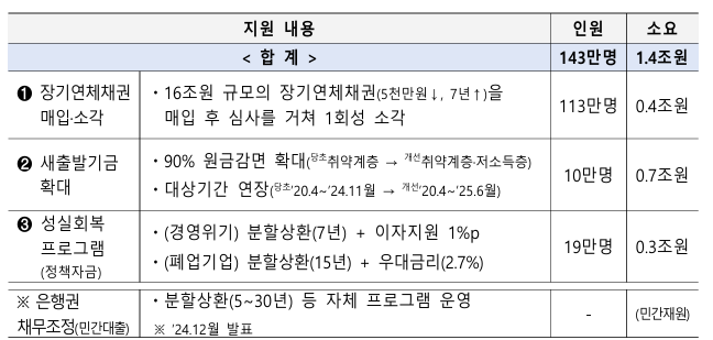 - (채무조정) 고금리기간누적된채무상환부담을경감하기위해 취약차주143만명대상’특별채무조정패키지’마련(+1.4조원)-16조원규모의➊장기연체채권매입·소각및➋새출발기금 지원대상,원금감면확대로신속한일상회복지원(+1.1조원)-정책자금을성실하게상환중인취약소상공인에게도 ➌성실회복프로그램을통해채무부담경감(+2,904억원)