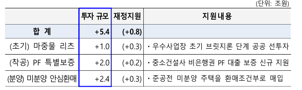 - (PF 지원) 단계별 맞춤형 유동성 5.4조원 공급(신규0.8조원)- 자금조달이 어려운 사업장에 특별 보증, 정부 출자 리츠를 통해 총 3.0조원 규모의 금융 지원(5,000억원)- 지방 건설사의 유동성 위기 극복을 위해 ’28년까지 준공전 미분양 주택 1만호를 환매조건부*로 매입(3,000억원) * 분양가격의 50% 수준으로 매입하고 준공후 ‘매입가격 + 이자비용’으로 환매