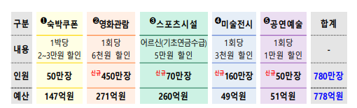 - (할인쿠폰) 숙박, 영화 관람, 스포츠시설 등 5대 분야 소비 진작을 위한 할인쿠폰 780만장 제공(+778억원)
