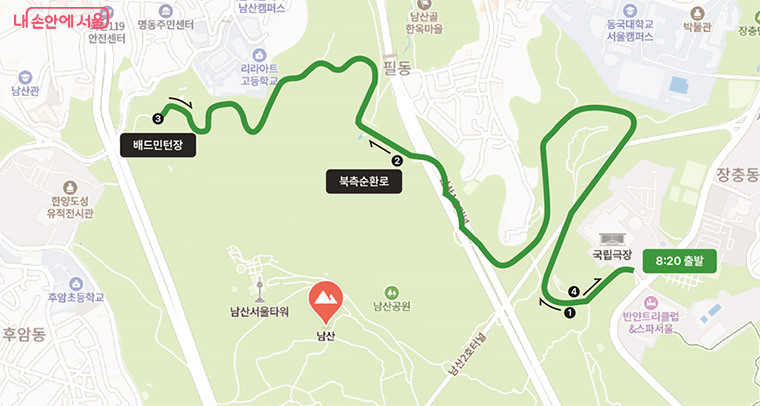 (난이도: 하)는 오전 8시 20분 남산국립극장에서 출발하여 북측순환로를 따라 걷다가 반환점을 돌아 다시 국립극장으로 돌아오는 왕복 6km 코스로, 1시간 30분이 소요된다. 북측순환로는 남산둘레길 중 가장 넓고 경사가 완만해 유아 또는 반려견을 동반한 가족들도 무리 없이 편안하게 걸을 수 있다.